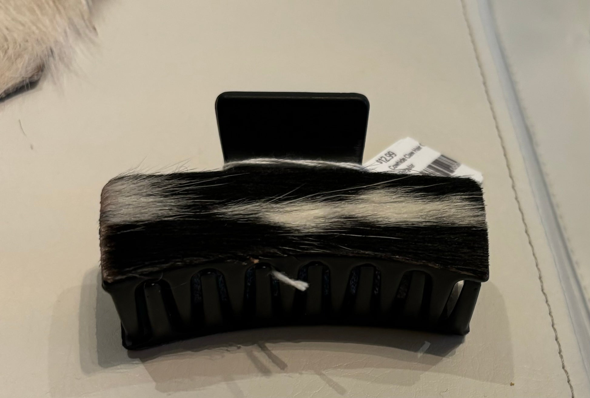 A very heavy duty claw hair clip adorned with our favorite material. Natural cowhide in assorted patterns and colors. Matte black clip. This hair clip is designed to accommodate all hair types, whether it's thick, thin, curly or straight. Its large claw teeth are designed to secure your hair in place comfortably, and it's lightweight enough to wear all day without causing any discomfort. A little over 3.25” in length.