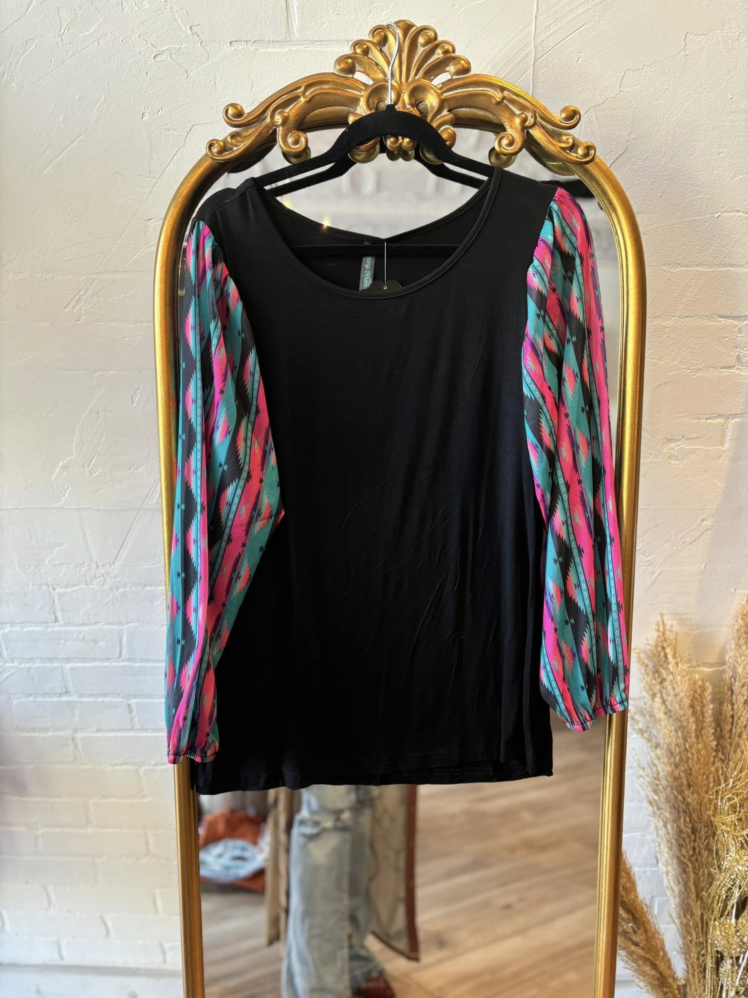 This top is so fun! This is another bubble sleeve with the perfect color combo! The pink, and turquoise pop off the black base! This shirt has the prettiest sheer sleeves and little flare cuffs for a little extra pizzazz! This shirt is so flattering and comfortable! It runs true to size!